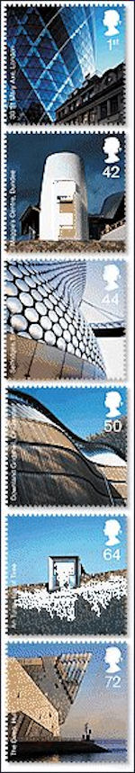 Previous stamp issues that specifically featured modern architecture were British architects in Europe in 1987, and British Architecture back in 1971. The former featured designs by Richard Rogers who was responsible for the famous Pompidou Museum in Paris, and also the designs of Norman Foster, Designer of the Willis Faber and Dumas building in Ipswich.Another Foster project was London's Millennium Bridge, which was featured in the Bridges of London issue in 2002. Other London projects that have been featured are the Tate Modern Life in the Life and Earth Issue of April 2000, and the Millennium Bridge in Gateshead, which was featured in the People and Places issue of June 2000.