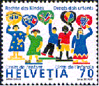 Annette Maïga of the Swiss Post designed this stamp which features the children from the five continents. They are holding up hearts symbolising loving care and the housing environment, education and training, health, leisure and food.